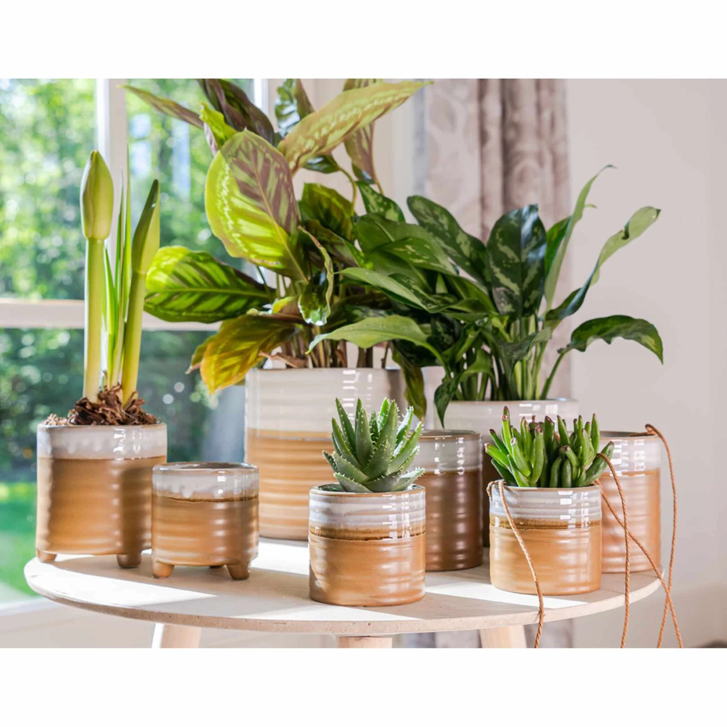 Der dezente Blumentopf Nikkie lässt dein Wohnzimmer ergrünen. Der obere Bereich des Pflanzgefäßes ist glasiert und fühlt sich glatt an. Der untere Bereich steht im Kontrast und ist in einem unglasiertem beigen Farbton gehalten.