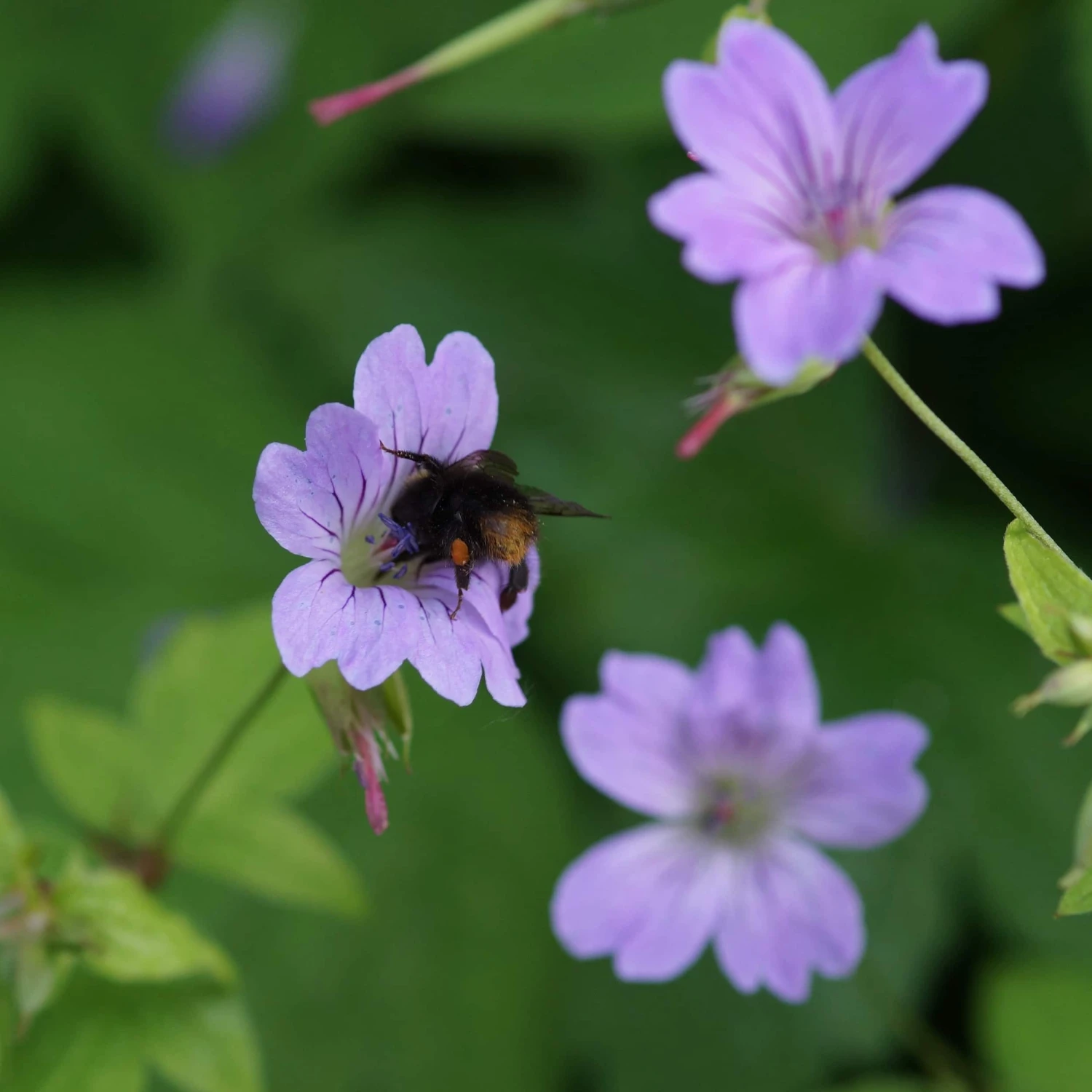 Mit seiner violetten Blütenpracht zieht der Knotige Bergwald-Storchschnabel (Geranium nodosum) Bienen und andere Insekten an und dient ihnen als wertvolle Nahrungsquelle. Er blüht von Frühling bis Sommer und manchmal sogar bis in den Herbst hinein. Dabei bildet dieser Storchschnabel dichte Teppiche aus Laub und eignet sich so hervorragend als Bodendecker. Mit seinem dichten bis lockeren, buschigen und aufrechten Wuchs erreicht er eine Höhe von 40 bis 50 Zentimetern und eine Breite von 30 Zentimetern.