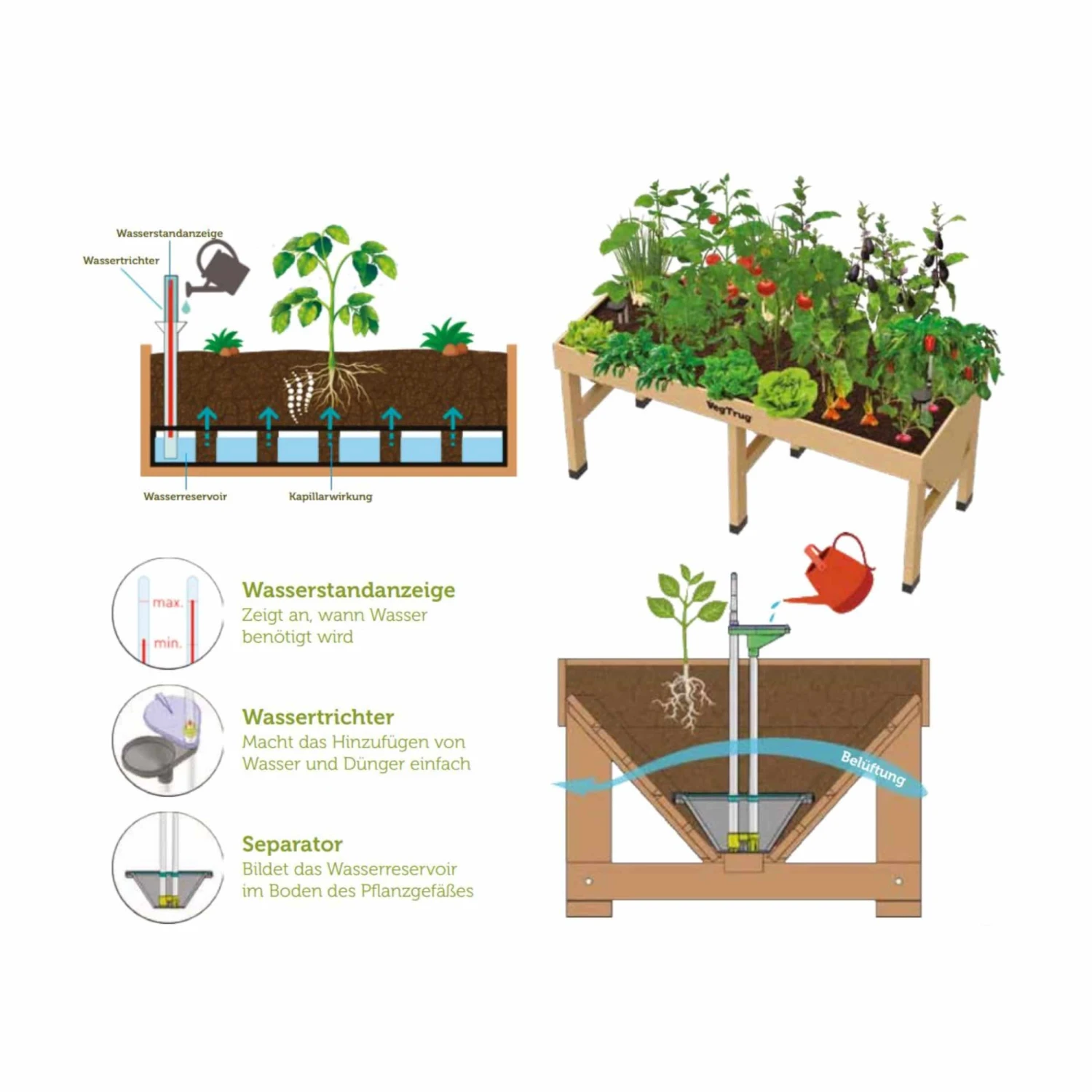 Das Selbstbewässerungssystem ist ein innovatives und dennoch einfaches System, das perfekt mit dem 1,80 m VegTrug Klassik kompatibel ist.