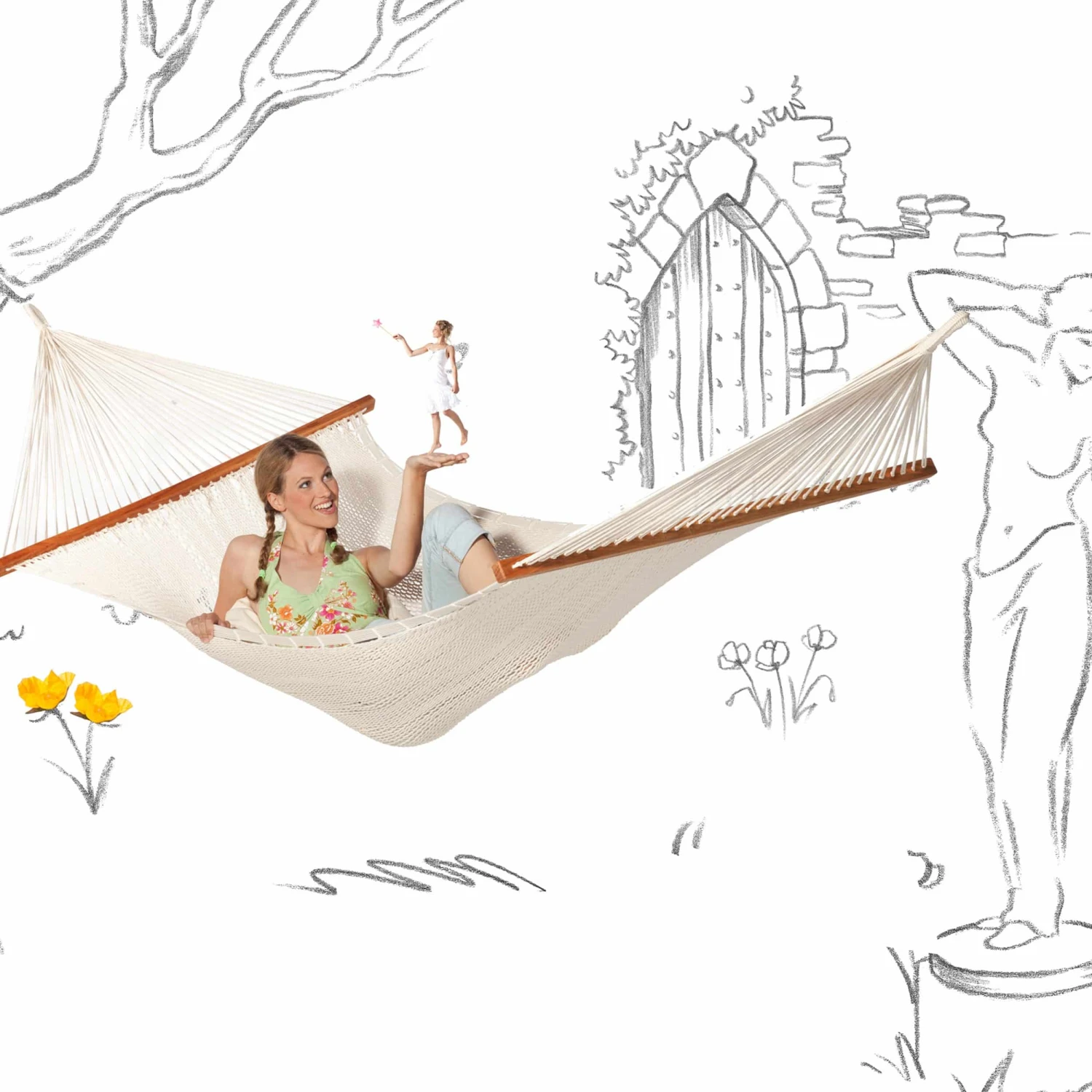 Diese Stab-Hängematte ist die Besondere unter den Hängematten. Sie ist aus geflochtener Bio-Baumwolle gefertigt und ein schöner Blickfang im Garten. Die Hängematte ist weich und anschmiegsam und gibt dennnoch Halt und Stabilität.