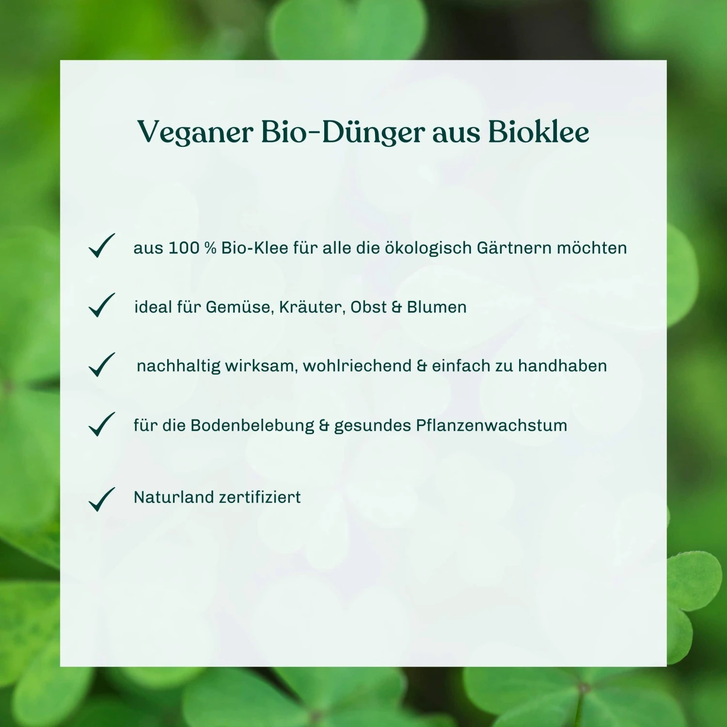KleePura ist der erste zertifizierte Bio-Dünger für Balkon & Garten aus 100 % Bio-Zutaten. KleePura ist rein pflanzlich (vegan) und enthält keine Abfälle der Massentierhaltung sowie konventionellen Lebensmittelindustrie. Mit KleePura Bio-Dünger in Naturland Qualität können Gartenanfänger und Profis gleichermaßen erfolgreich durch und durch nachhaltig & ökologisch Gärtnern und reichhaltig, geschmackvoll & gesund Ernten. KleePura wird aus 100 % Bio-Klee in Deutschland hergestellt und enthält alle Nährstoffe sowie Spurenelemente, die Balkon- und Beetpflanzen benötigen.