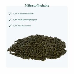 Makronährstoffgehalte: 3,5 % N-Gesamtstickstoff; 0,8 % P2O5-Gesamtphosphat; 3,4 % K2O–Kaliumoxid. Nebenbestandteile: 1,7 % CaO-Calciumoxid (basisch wirksame Bestandteile); 0,5 % MgO-Magnesiumoxid; 0,3 % S-Schwefel; < 0,1 % Na-Natrium. Organische Substanz 90,6 %; Wassergehalt 9,4 %; Mikronährstoffgehalte: Natriumgehalt < 1000 mg/kg; Chloridgehalt 2200 mg/kg; Borgehalt [wasserlöslich] < 50 mg/kg; Kobaltgehalt < 5,0 mg/kg; Kupfergehalt 10,3 mg/kg; Selengehalt < 2,0 mg/kg; Zinkgehalt 31,9 mg/kg. Die Schwermetallgehalte unterschreiten die Kennzeichnungsschwellen und Grenzwerte für Schadstoffe in Düngemitteln (DüMV). Frei von Kleesamen. Hergestellt in Deutschland.